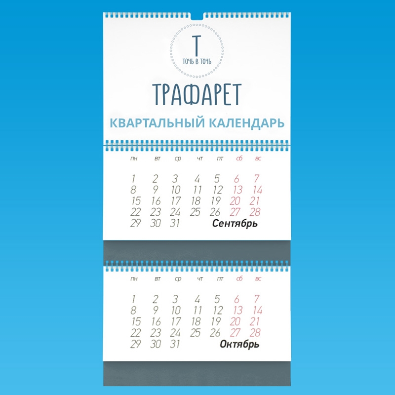 Типография ТРАФАРЕТ изготавливает яркие квартальные календари в соответствии с цветами фирменного стиля Вашей компании. Обратившись к нам, Вы получите очень стильный и удобный календарь, который на удивление гостей и зависть конкурентов будет стильно и презентабельно смотреться в любом офисе или кабинете!